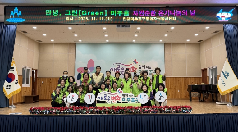 [메이저뉴스]인천 미추홀구종합자원봉사센터(센터장 유중형)는 지난 11일 구청 대회의실에서 ‘2025 안녕, 그린미추홀 – 자원순환 온기 나눔의 날’을 진행했다.