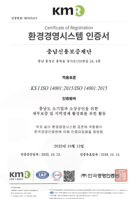 [메이저뉴스] 충남신용보증재단은 한국경영인증원(KMR)으로부터 ISO 14001:2015(환경경영시스템) 인증을 취득했다고 17일 밝혔다.