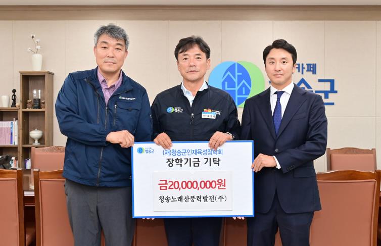 [메이저뉴스]청송노래산풍력발전(주)은 지난 16일 지역사회와의 상생 및 미래 인재 육성을 위해 (재)청송군인재육성장학회에 장학금 2천만 원을 기탁했다.