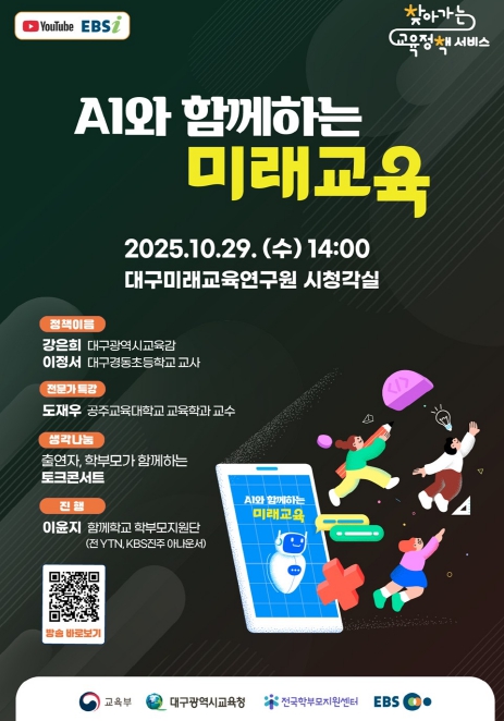 이번 행사는‘AI와 함께하는 미래교육’을 주제로 학부모가 국가 및 지역 교육정책의 방향을 이해하고, 정책 형성과 실행 과정에 참여할 수 있도록 돕기 위해 마련된 자리로, 대구시교육청과 교육부가 공동 주최하고 한국교육방송공사(EBS)가 주관한다.