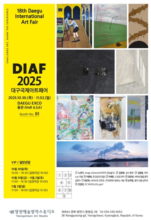 [메이저뉴스]영천예술창작스튜디오는 30일 프리뷰를 시작으로 11월 2일까지 4일간, 대구 엑스코 동관(홀 4·5·6)에서 열리는 ‘대구국제아트페어 2025(DIAF 2025)’에 17기 입주작가 9명의 작품 29점을 출품한다.