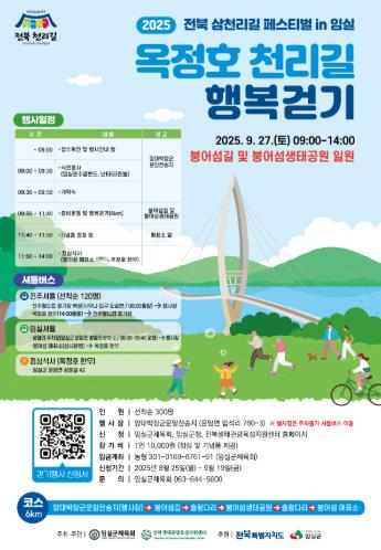 [메이저뉴스]임실군체육회와 전북생태관광육성지원센터 주관으로 오는 9월 27일 오전 9시 옥정호 붕어섬과 천리길 일원에서‘전북 삼천리길 페스티벌 in 임실 – 2025 옥정호 천리길 행복걷기’를 개최한다.