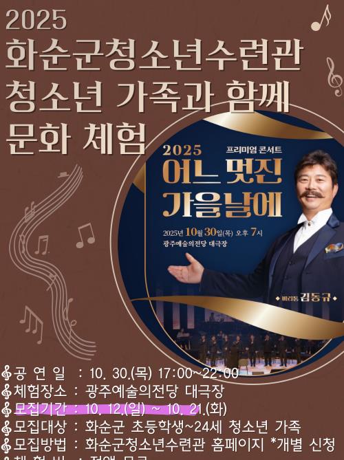 [메이저뉴스] 화순군은 2일 청소년수련관에서 짙어가는 가을의 정취 속에 청소년과 가족이 함께하는 특별한 문화체험, 바리톤 김동규의 프리미엄 콘서트'어느 멋진 가을날'을 관람할 청소년 가족 60명을 선착순 모집한다고 밝혔다.