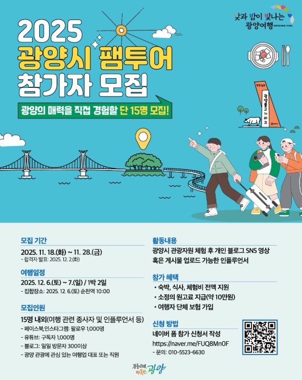 [메이저뉴스]광양시가 낮과 밤이 빛나는 광양의 매력적인 관광자원을 직접 체험하고, 감각적인 콘텐츠로 널리 홍보할 영향력 있는 ‘2025 G-관광 팸투어’ 참가자를 모집한다.