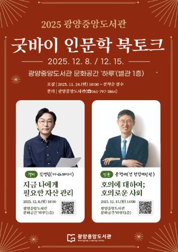 [메이저뉴스]광양중앙도서관은 연말을 맞아 시민들의 자기성찰과 삶의 재정비를 돕기 위한 '굿바이 인문학 북토크'를 운영한다고 밝혔다.