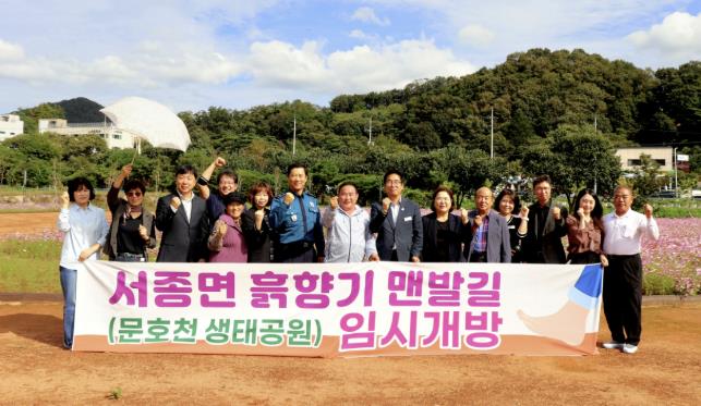 ‘서종면 흙향기 맨발길’은 하늘에서 바라보면 서종면의 ‘서’ 자를 형상화한 걷기 코스로, 문호천의 아름다운 자연경관과 어우러진 생태 친화형 산책길이다. 특히, 약 1,500평 규모에 만개한 코스모스 꽃밭은 행사 당일 주민들과 방문객들의 눈길을 사로잡으며 큰 호응을 얻었다.