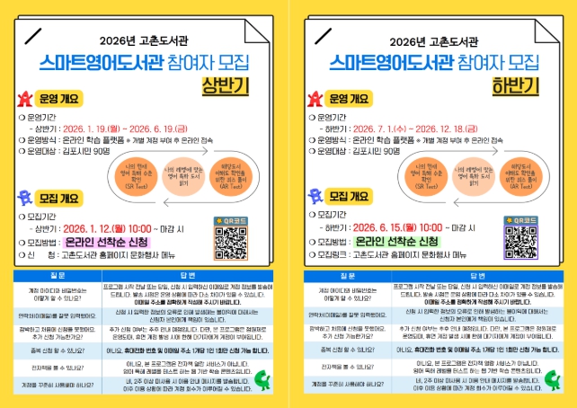 [메이저뉴스]김포시 고촌도서관이 2026년 1월 19일부터 12월 18일까지 ‘2026년 스마트영어도서관’을 운영한다.