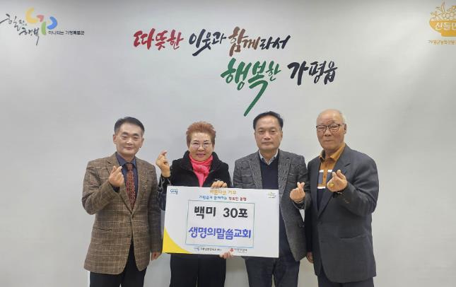 장석조 가평읍장은 “관심과 나눔을 실천해 주신 생명의 말씀교회에 진심으로 감사드린다”며 “기탁자의 뜻에 부응해 취약계층 지원에 더욱 힘쓰겠다”고 밝혔다.