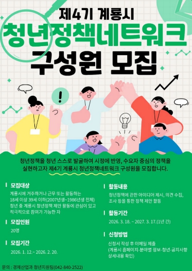 [메이저뉴스]충남 계룡시는 이달 12일부터 오는 2월 20일까지 제4기 청년정책네트워크에 참여할 지역 청년을 모집한다.