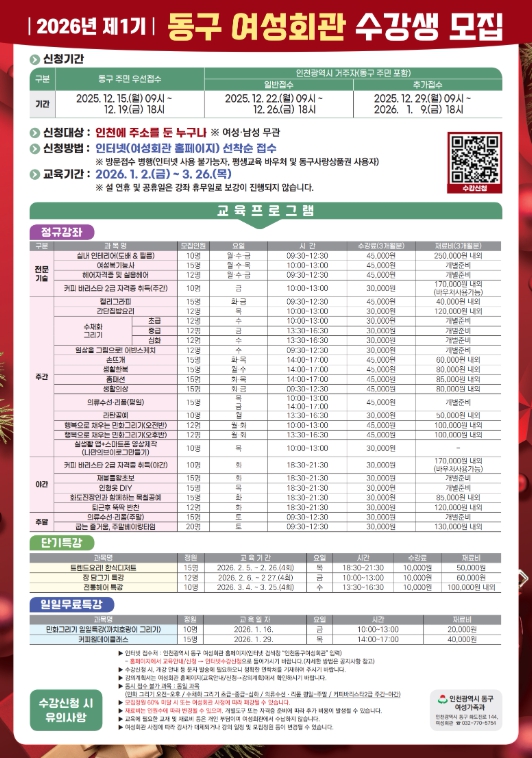 | ▲ 인천 동구, 2026년 제1기 동구여성회관 수강생 모집 |
