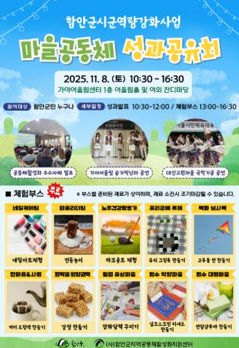[메이저뉴스] 함안군은 오는 11월 8일 가야어울림센터에서 ‘마을공동체 성과공유회’를 개최한다고 밝혔다.
