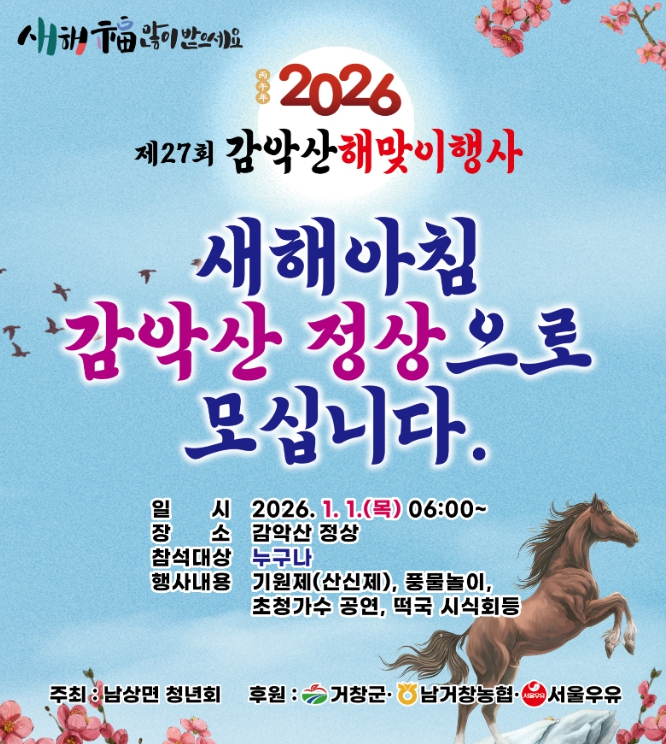 [메이저뉴스] 거창군은 병오년(丙午年) 새해를 맞아 군민의 안녕과 지역 발전을 기원하는 '제27회 감악산 해맞이 행사'를 2026년 1월 1일 오전 6시부터 9시까지 감악산 정상에서 개최한다.