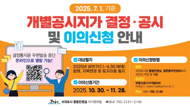 한편, 서귀포시는 시민 편의를 위해 개별공시지가 365 소통 창구, 문자 알림 서비스 신청 게시판을 운영하고 있다. 문자 알림 서비스를 신청하면 의견 제출 기간과 이의신청 기간 등 주요 일정을 문자로 안내받을 수 있다.
