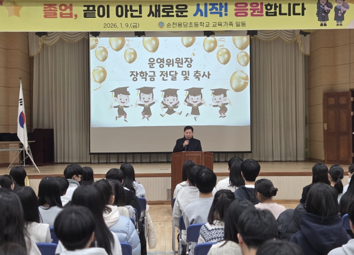 김 위원장은 이날 축사를 통해 “졸업생 여러분은 순천용당초등학교에서 배움의 기쁨과 친구의 소중함, 그리고 서로를 존중하고 배려하는 마음을 배웠다”라며 “이 경험은 앞으로 어떤 길을 가든 여러분을 바르게 이끌어 줄 평생의 자산이 될 것”이라고 말했다.