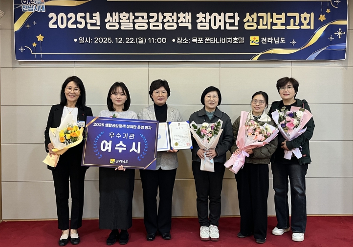 | ▲ 지난 22일 목포 폰타나비치호텔에서 열린 ‘2025년 생활공감정책 참여단 성과보고회’에서 여수시가 전남도지사 기관 표창을 수상했다. |
