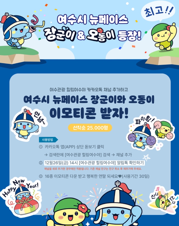 [메이저뉴스]여수시가 새롭게 리뉴얼된 마스코트 ‘장군이·오동이’ 카카오톡 이모티콘을 오는 26일 오후 2시부터 선착순 2만 5천 명에게 무료로 배포한다고 밝혔다.