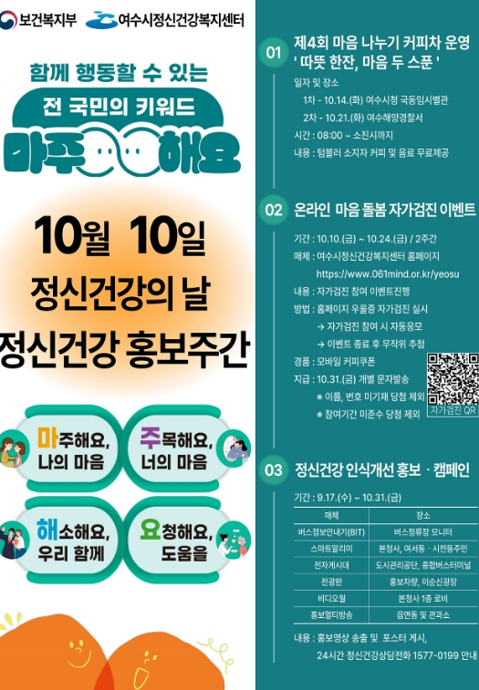 [메이저뉴스]여수시는 정신건강의 날(10월 10일)을 기념해 10월 10일부터 24일까지 ‘2025년 정신건강 홍보주간’을 운영한다.