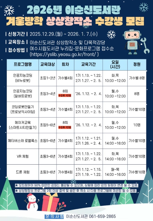 [메이저뉴스]여수시는 12월 29일부터 2026년 1월 7일까지 ‘2026년 이순신도서관 겨울방학 상상창작소’ 수강생을 선착순 모집한다.