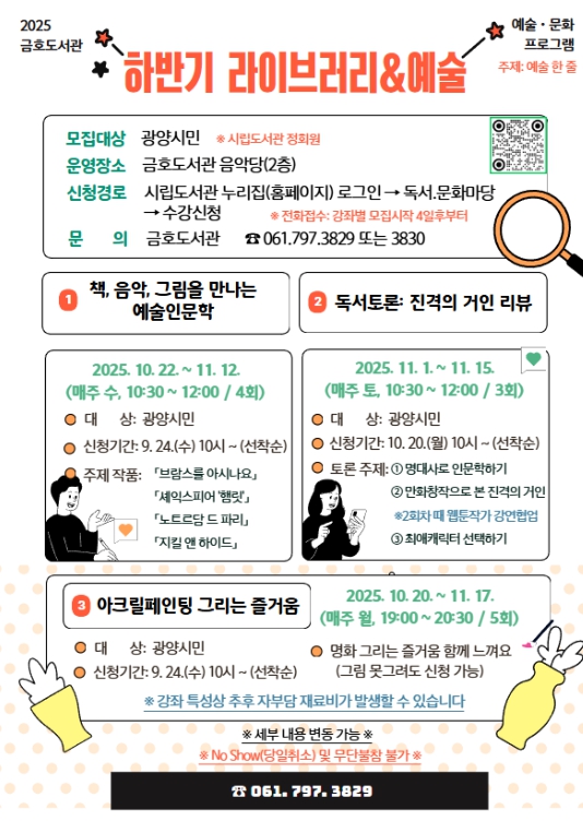 [메이저뉴스]광양시 금호도서관은 오는 10월부터 11월까지 하반기 프로그램 '라이브러리·예술'을 운영한다고 밝혔다.