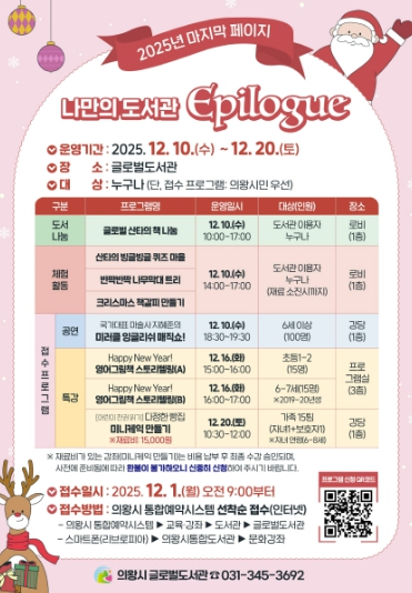 [메이저뉴스]의왕시 글로벌도서관(보식골로 30-10)에서는 올 한 해를 마무리하며 시민들이 풍성한 문화 향유 기회를 가질 수 있도록 연말 특별 행사'나만의 도서관 에필로그'를 12월 10일부터 20일까지 10일간 운영한다.