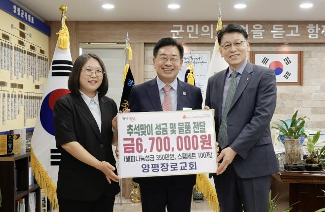 [메이저뉴스]양평군은 지난 23일 양평장로교회가 추석 명절을 맞아 어려운 이웃을 돕기 위해 320만 원 상당의 스팸세트 100개와 해피 나눔 성금 350만 원을 기탁했다고 밝혔다.