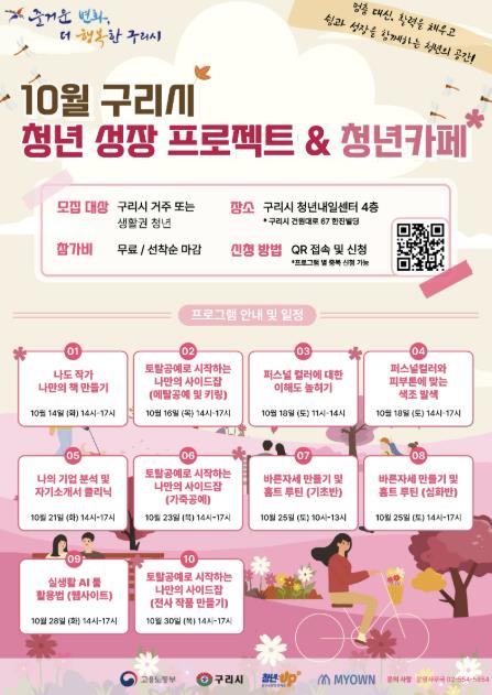 10월 프로그램은 구리시에 거주하거나 생활하는 15세부터 39세까지의 청년을 대상으로 하며, 취업·창업 준비, 자기 계발, 건강 관리 등 실용적인 주제를 담은 총 10개 강좌로 운영된다. 각 강좌는 선착순 20명으로 제한된다.
