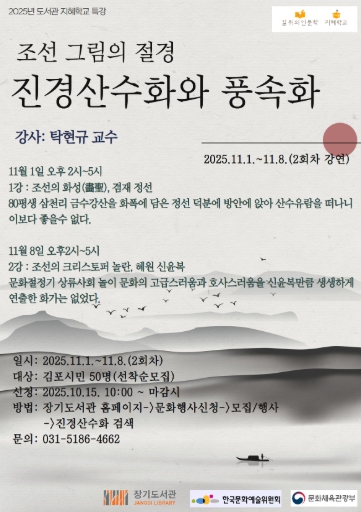 [메이저뉴스]김포시 장기도서관은 2025년 도서관 지혜학교 특강으로 '조선 그림의 절경 진경산수화와 풍속화'를 오는 11월 1일, 11월 8일 오후 2시부터 5시까지 장기도서관 대강당에서 운영한다고 밝혔다