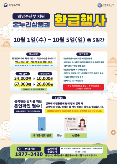 이번 행사는 10월 1일부터 10월 5일까지 5일간 진행되며, ▲신거북·거북시장 ▲강남시장 ▲가좌시장에서는 국산 수산물 구매 시, ▲인천축산물시장에서는 국산 농축산물 구매 시 온누리상품권 환급 혜택이 제공된다.