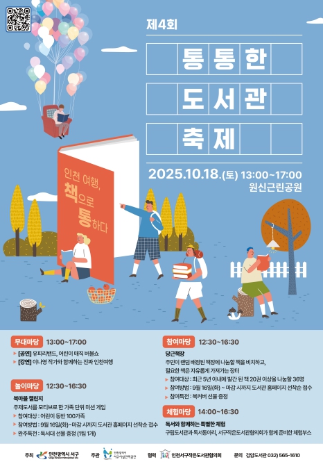 [메이저뉴스]인천 서구 구립도서관(검암·단봉늘봄·검단·심곡·석남·신석 도서관)이 오는 18일 원신근린공원에서 ‘제4회 통통한 도서관 축제’를 개최한다.