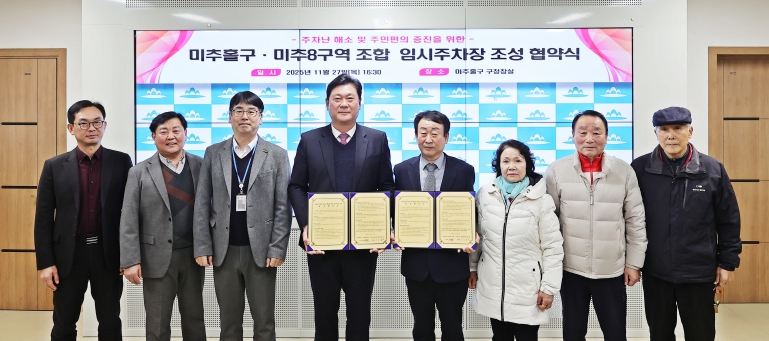 [메이저뉴스]인천 미추홀구는 지난 27일 구청장실에서 미추8구역 주택재개발정비사업 조합과 ‘임시주차장 조성 협약’을 체결했다.