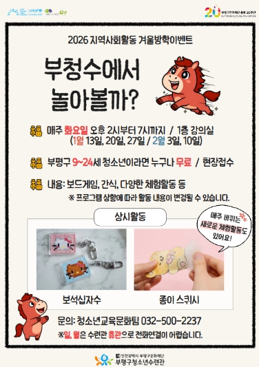 [메이저뉴스]부평구 청소년수련관은 오는 20일부터 다음달 10일까지 겨울방학을 맞아 지역 청소년을 위한 2026 지역사회활동 겨울방학 이벤트 ‘부청수에서 놀아볼까’를 진행한다.