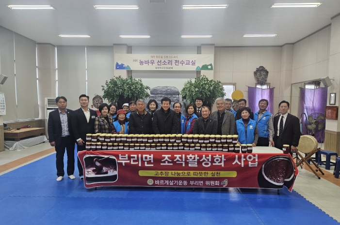 [메이저뉴스]금산군 부리면바르게살기운동위원회(위원장 양원식)는 지난 27일 평촌리 농바우끄시기전수관에서 회원 30여 명이 참여한 가운데 지역 내 소외계층을 위한 이웃사랑 고추장 담그기 봉사를 진행했다.