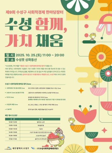 [메이저뉴스]대구 수성구는 오는 25일 오전 11시부터 오후 8시까지 수성못 상화동산 일대에서 사회적경제기업의 지속적인 성장과 자립 기반을 지원하고, 사회적 가치 실현을 주민과 함께 공유하기 위한 ‘2025 제9회 수성구 사회적경제 한마당 장터’를 개최한다고 밝혔다.