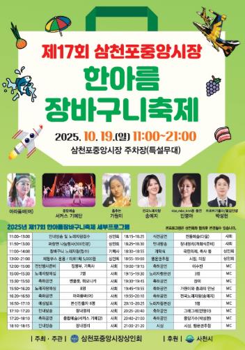 [메이저뉴스]사천시는 10월 19일 삼천포중앙시장 공영주차장(특설무대)에서 ‘제17회 삼천포중앙시장 한아름 장바구니 축제’를 개최한다고 14일 밝혔다.