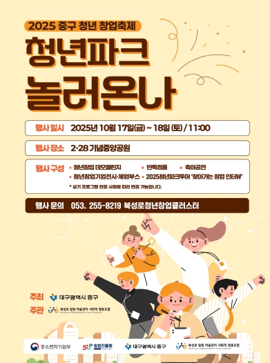 [메이저뉴스]대구 중구는 청년창업가와 지역 주민이 함께 어울릴 수 있는 교류의 장을 마련하고자 2025년 중구 청년창업 축제 '청년파크 : 놀러온나'를 오는 10월 17일부터 18일까지 양일간 2·28기념중앙공원에서 개최한다고 밝혔다.
