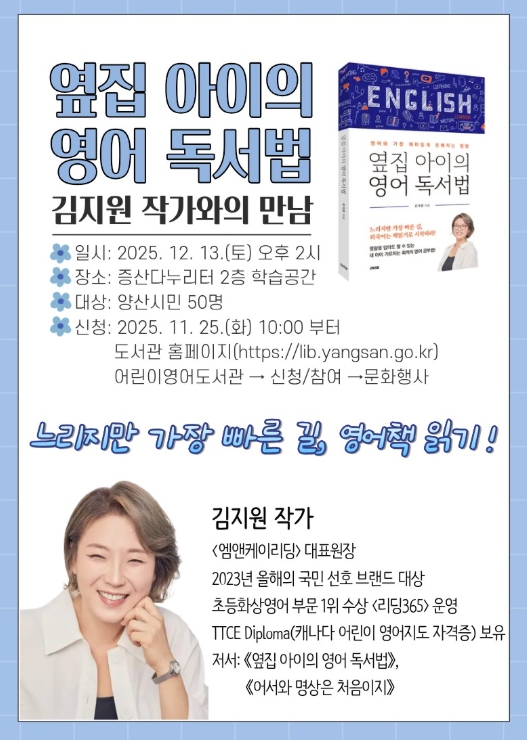 [메이저뉴스]양산시립 어린이영어도서관은 오는 12월 13일 오후 2시 『옆집 아이의 영어 독서법』의 저자 김지원 작가를 초청하여 작가와의 만남을 운영한다.