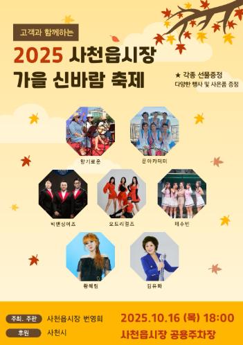 [메이저뉴스]사천시는 오는 16일 사천읍시장 공영주차장(특설무대)에서 ‘제15회 사천읍시장 가을 신바람 축제’를 개최한다고 14일 밝혔다.