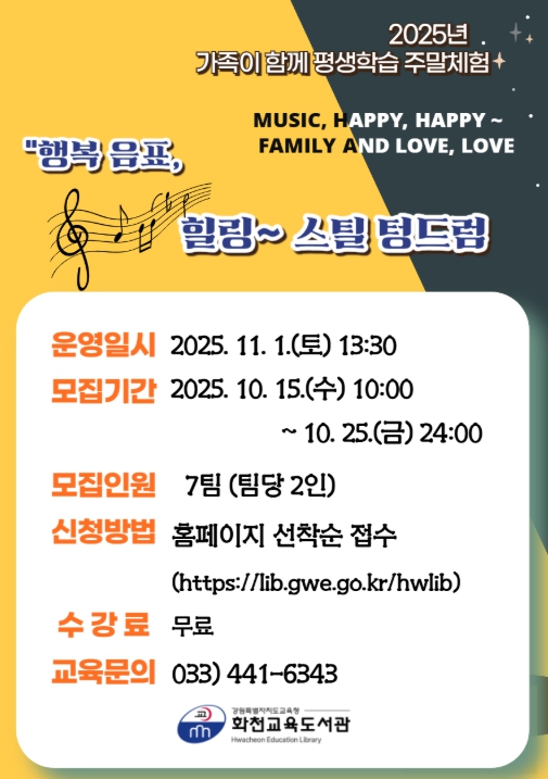 [메이저뉴스]강원도교육청 화천교육도서관은 군민을 대상으로 2025년 11월 평생학습 주말체험 ‘늦가을, 가족 음악 특강: 행복 음표, 힐링 스틸 텅드럼’을 운영한다.