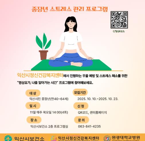 [메이저뉴스]익산시정신건강복지센터는 만 40~64세 중장년을 대상으로 '마음힐링 명상요가' 프로그램을 운영한다고 10일 밝혔다.