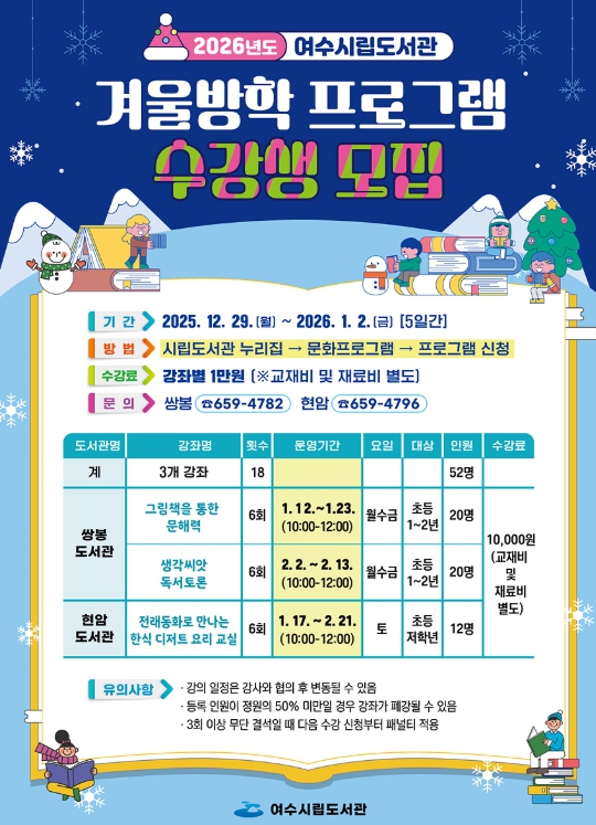 [메이저뉴스]여수시립도서관은 오는 12월 29일부터 2026년 1월 2일까지 5일간 관내 초등학생을 대상으로 2026년 겨울방학 프로그램 수강생 52명을 선착순 모집한다.