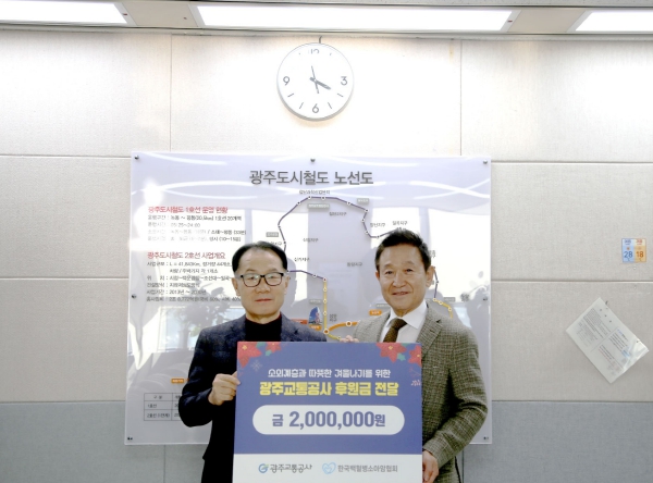 [메이저뉴스]광주교통공사가 최근 광주시 서구 마륵동 본사에서 (사)한국 백혈병소아암협회 광주전남지회에 임직원들이 정성으로 모은 성금 200만 원을 전달하며 환아들의 따뜻한 연말연시를 기원했다.