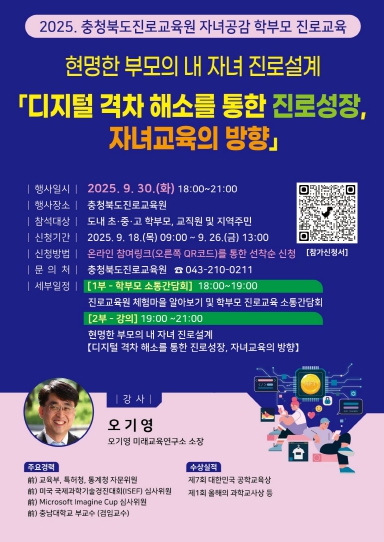 [메이저뉴스]충청북도교육청 직속기관 진로교육원은 오는 30일 18시에 학부모들이 변화하는 미래사회에 맞춰 자녀의 진로설계 역량을 강화할 수 있도록 2025 하반기 학부모 진로교육을 운영한다고 밝혔다.