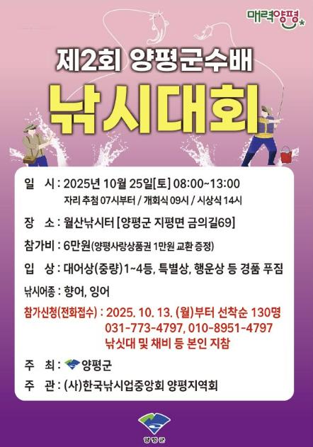 [메이저뉴스]양평군은 오는 25일 관내 월산낚시터에서 ‘제2회 양평군수배 낚시 대회’를 개최한다고 밝혔다.