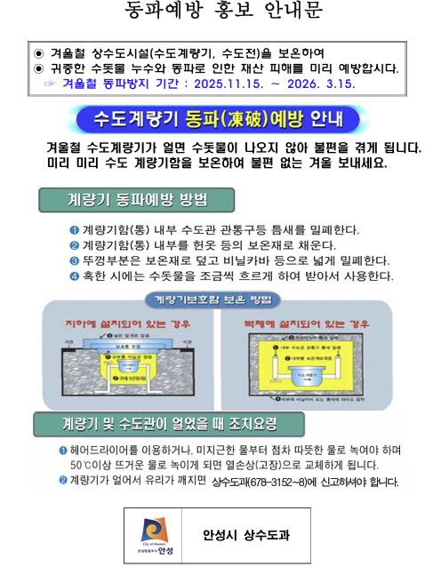 ▲ 안성시, 동절기 급수공사 중지 예고 및 계량기 동파 방지 안내