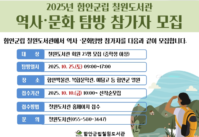 [메이저뉴스]함안군립 칠원도서관이 '2025년 하반기 역사·문화탐방' 프로그램 참가자를 모집한다.