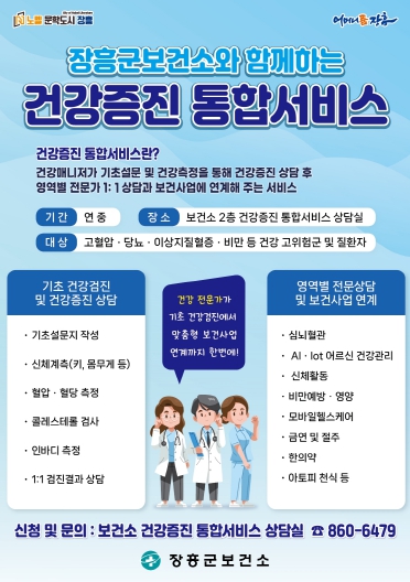 한편, 서비스 참여를 희망하는 장흥군민은 장흥군보건소 건강증진 통합서비스 상담실로 문의(사전 예약)하면 된다.