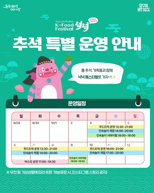 한정훈 서울시 소상공인정책과장은 “케데헌 돌풍으로 세계가 K-컬처에 주목하는 지금, ‘넉넉’이 K-푸드를 통해 서울의 맛과 멋을 즐길 수 있는 특별한 공간이 되길 바란다”며 “추석 연휴 동안 가족, 친구, 관광객 모두가 K-푸드와 함께 전통 놀이, 공연 등 다양한 즐길 거리로 행복한 시간 보내시길 바란다”고 말했다.