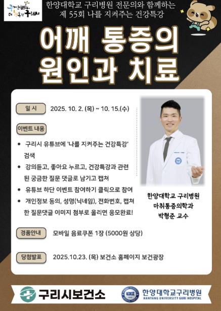 [메이저뉴스]구리시는 오는 10월 2일, 시민들의 근골격계 질환 예방과 건강관리 역량 강화를 위해 '어깨 통증의 원인과 치료'를 주제로 한양대학교 구리병원 마취통증의학과 박형준 교수와 함께하는 ‘나를 지켜주는 건강특강’을 구리시 공식 유튜브 채널(구리비전)을 통해 송출한다고 밝혔다.