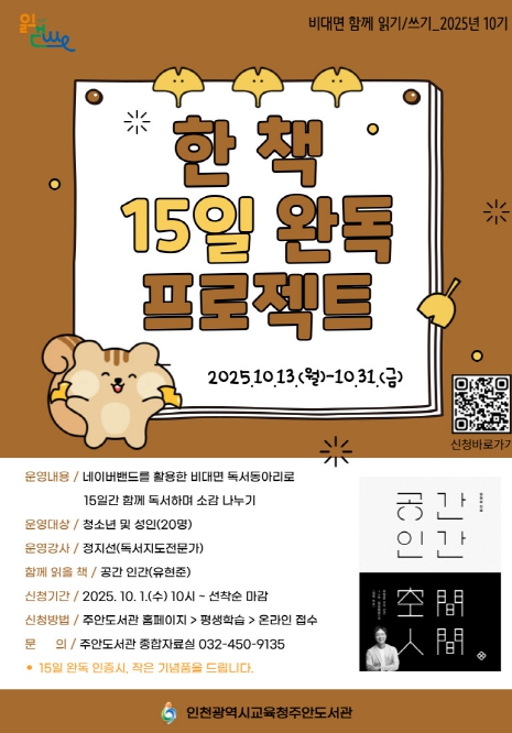 [메이저뉴스]인천광역시교육청주안도서관은 10월 1일 오전 10시부터 ‘2025년 10기 비대면 함께 읽기-한 책 15일 완독 프로젝트’ 참가자를 모집한다.