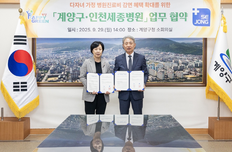 [메이저뉴스]인천광역시 계양구는 9월 29일 인천세종병원(병원장 오병희)과 ‘다자녀 가정 병원진료비 감면 확대’를 위한 업무협약을 체결했다.